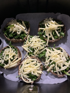 - 4. Sprinklethe grated mozzarella cheese over the spinach. Ensure that the cheese coversthe spinach enough so it cannot fly around in the air fryer once the fan is on.