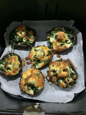 - This recipe can be used as an air fryer vegan recipe by simply removing the cheese from the recipe. Then blanch the spinach in a pot of boiling water and place them on top of the mushrooms once cooked in the air fryer. Drizzle some balsamic vinegar on top for some flavor.