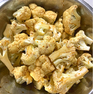 Handy tip- Cauliflower grows in tight clusters, making it easy for little insects to hide there. Soak the cauliflower florets in salt water for 30 minutes before seasoning and cooking to ensure that these little insects are removed.